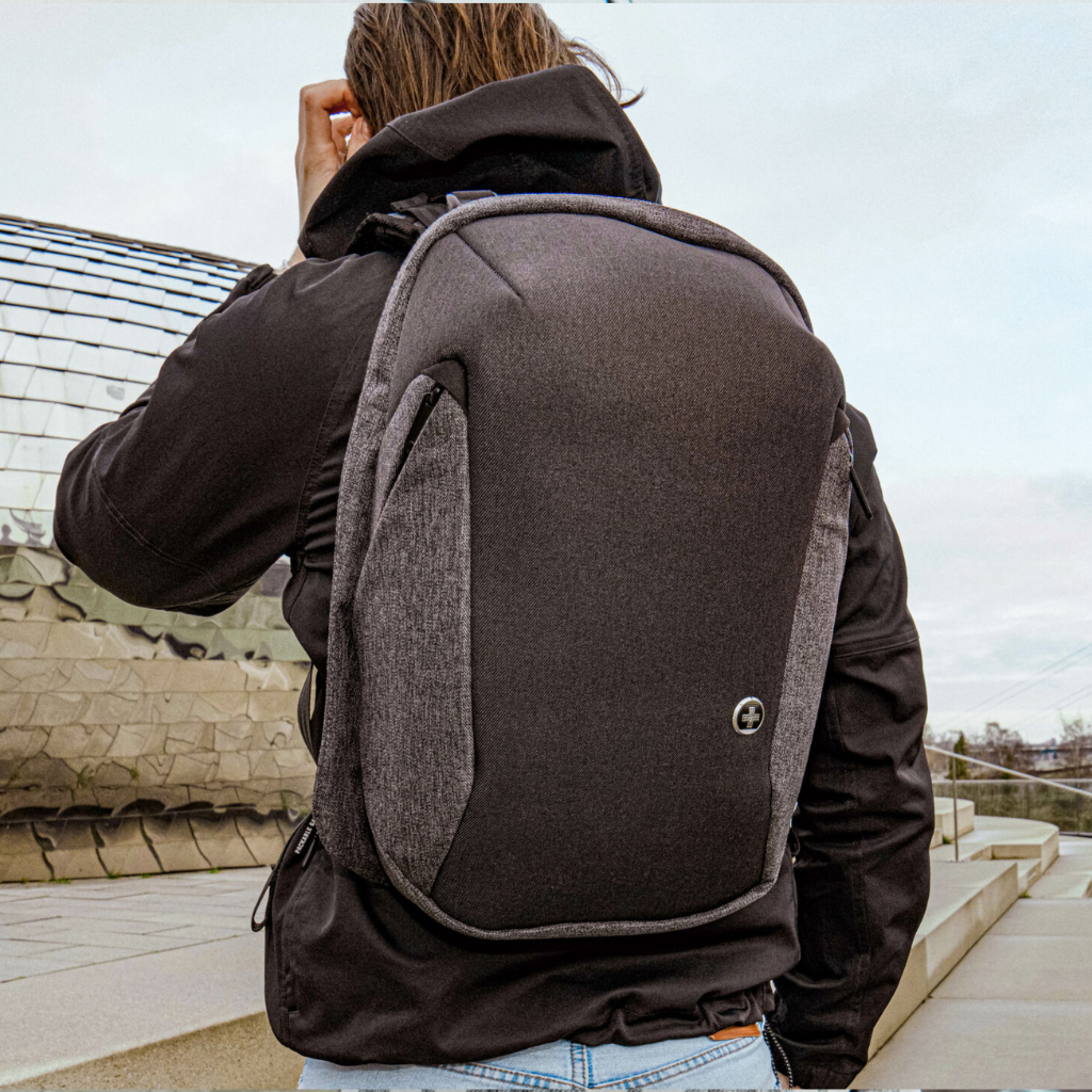 COSMO 3.0 è un elegante zaino nero con accenti grigi e un design insolito.